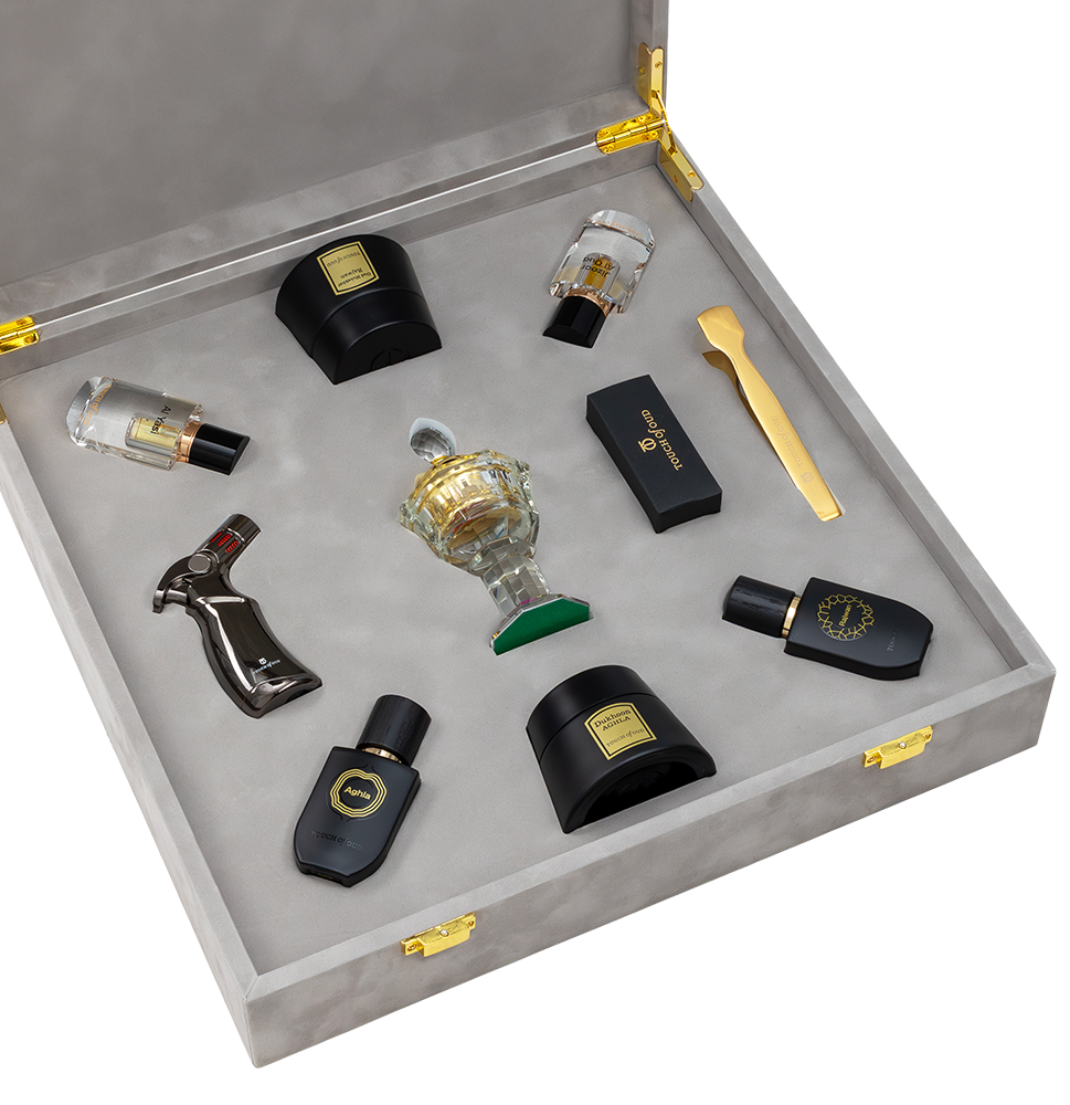 Experience the ultimate fragrance collection with the 10-Piece Touch of oud Grey Velvet Gift Set. This luxurious set features two mesmerizing perfumes - Rajwan and Aghla, 1 enchanting dukhoon blend Aghla and 1 Oud Mubakhar Rajwan, and two exquisite agarwood oils - Al Yasi and Jizoor Al Oud. Complete with a lighter, burner, charcoal, and tong, this gift set provides everything you need for a captivating fragrance journey. Treat yourself or someone special to this extraordinary collection and indulge in the essence of luxury.