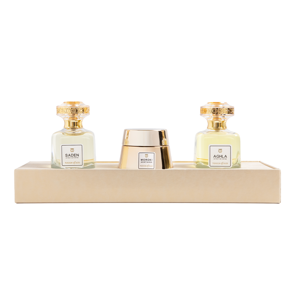 The Touch of Oud 3 PCs PCs Elegant Fragrance Set brings together fine fragrance and traditional bukhoor in one elegant collection. This thoughtfully assembled set includes the perfumes Saden and Aghla along with Moroki Bukhoor creating a complete sensory experience.