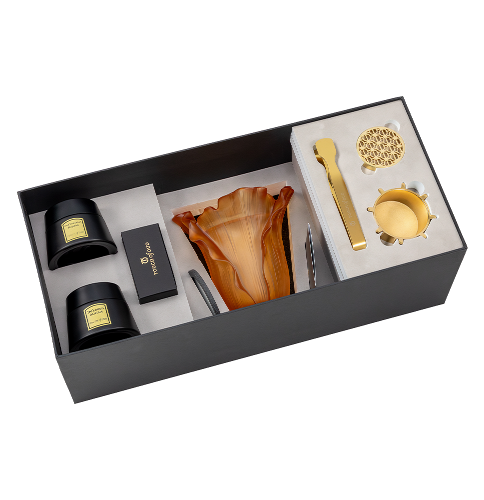 Send your gratefulness to your loved ones with an outstanding gift set from Touch of Oud.Five extraordinary pieces are laid in an exquisite box to express your love and appreciation for the ones whom you care about. Dukhoon and Bukhoor indulge the senses in healing the soul.You can place the Dukhoon or Bukhoor in the Amber cabbage burner and enjoy the scents which will make you fly to another dimension.