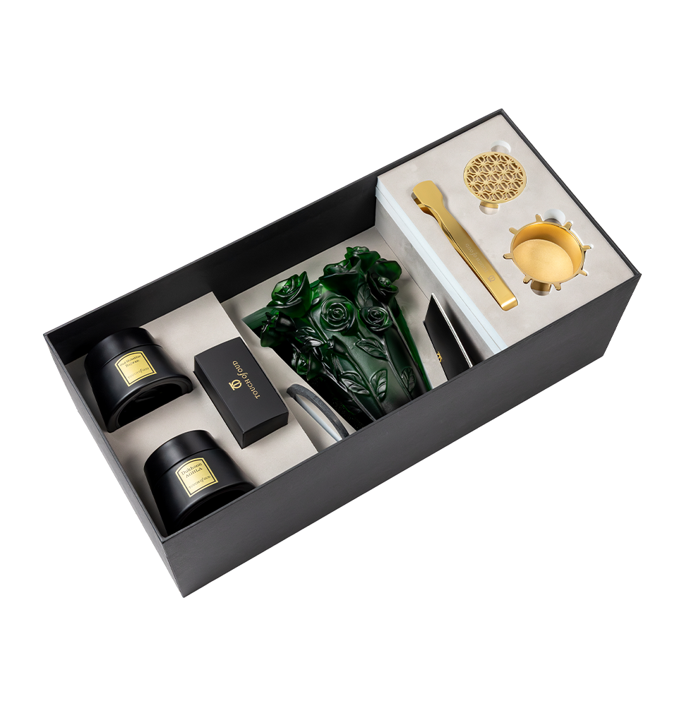 Send your gratefulness to your loved ones with an outstanding gift set from Touch of Oud.Five extraordinary pieces are laid in an exquisite box to express your love and appreciation for the ones whom you care about. Dukhoon and Bukhoor indulge the senses in healing the soul.You can place the Dukhoon or Bukhoor in the Dark Green flower burner and enjoy the scents which will make you fly to another dimension.