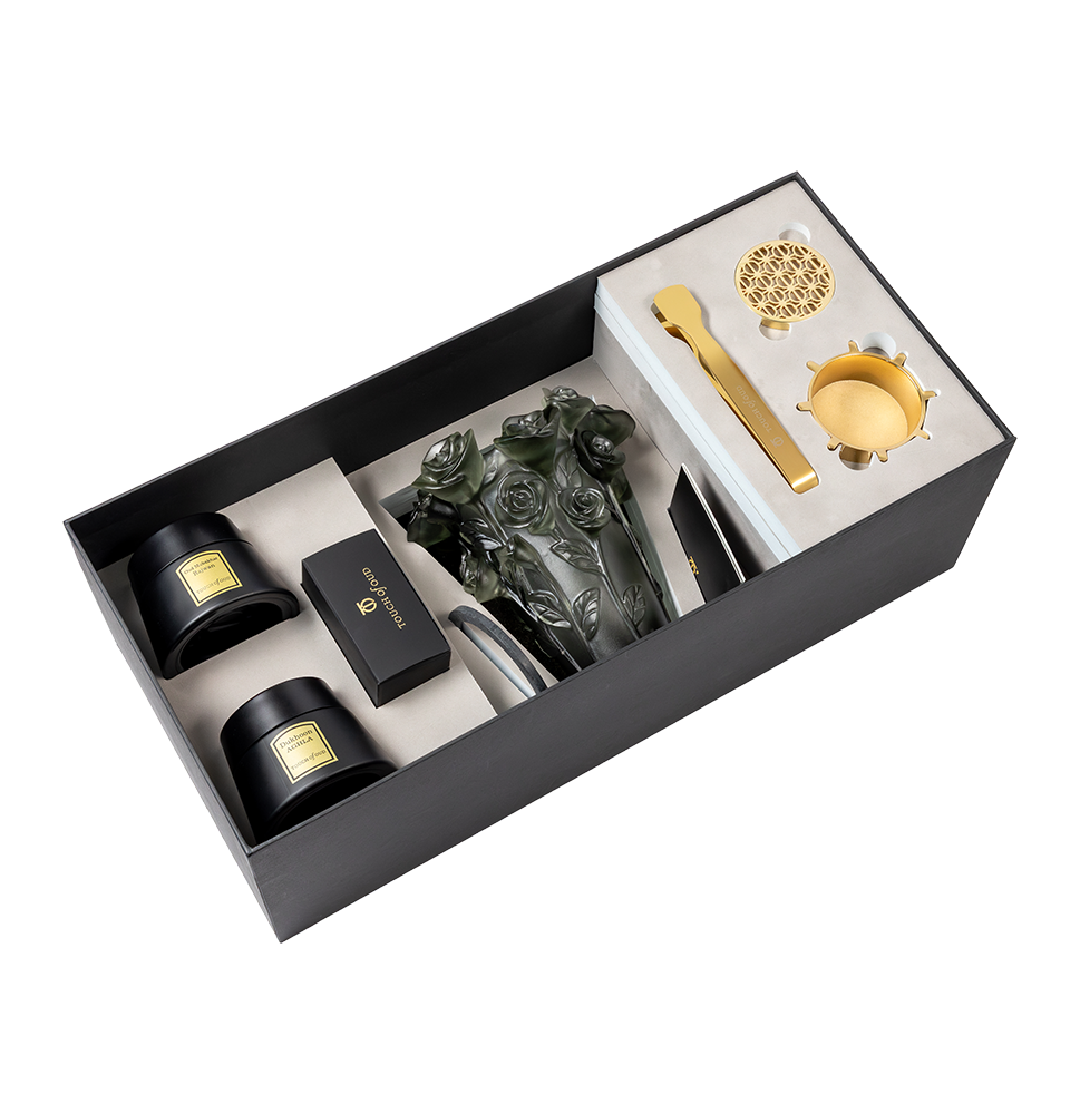 Share your gratefulness for your loved ones with an outstanding gift set from Touch of Oud.Five extraordinary pieces are laid in an exquisite box to express your love and appreciation for the ones whom you care about. Dukhoon and Bukhoor indulge the senses in healing the soul. You can place the Dukhoon or Bukhoor in the Grey Flower burner and enjoy the scents which will make you fly to another dimension