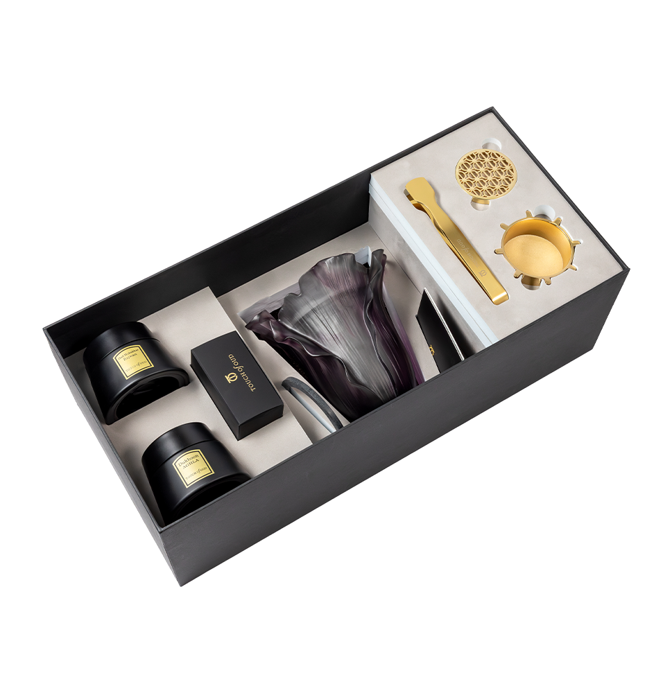 Send your gratefulness to your loved ones with an outstanding gift set from Touch of Oud.Five extraordinary pieces are laid in an exquisite box to express your love and appreciation for the ones whom you care about. Dukhoon and Bukhoor indulge the senses in healing the soul.You can place the Dukhoon or Bukhoor in the Grey Purple cabbage burner and enjoy the scents which will make you fly to another dimension.
